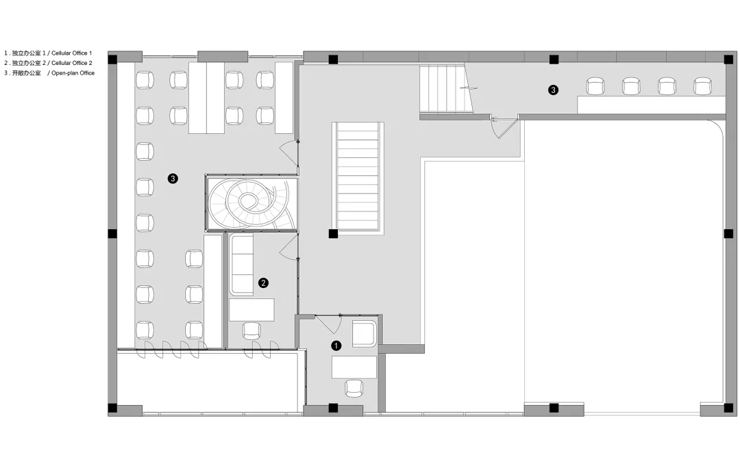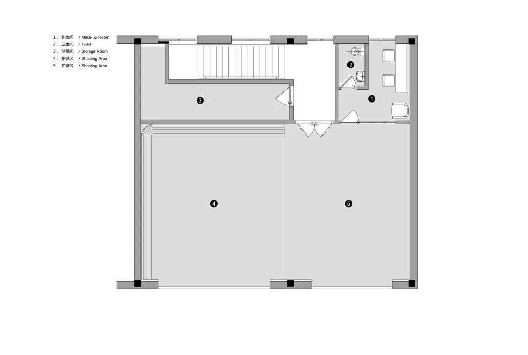 ASTUDIO攝影工作室位于CBD東側(cè)菁英谷文創(chuàng)園內(nèi),整體的設(shè)計(jì)風(fēng)格融合了粗狂工業(yè)風(fēng)和現(xiàn)代簡約風(fēng)。原有建筑為雙層的廠房空間,這種大空間非常適合拍攝的需求。攝影師希望把這個(gè)大空間改造為兩個(gè)相對獨(dú)立的拍攝區(qū),并且有各自獨(dú)立的化妝間和出入口,從而可以同時(shí)進(jìn)行兩場獨(dú)立的拍攝。UUA將原有的二層建筑在豎向上改造成為了三層的空間,其中第一層包含接待區(qū)和1號拍攝區(qū),第二層整體為辦公空間,第三層是2號拍攝區(qū),這種豎向上的分區(qū)保障了兩場同時(shí)拍攝的獨(dú)立性。