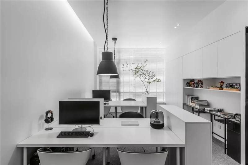 自由無拘的溝通對于團(tuán)隊的創(chuàng)新至關(guān)重要。開放的辦公區(qū)是有效獲取信息和激發(fā)靈感的地方。百葉窗折射的光影,充足的自然光營造高效的工作環(huán)境。空間雖然有限,但發(fā)揮最大的性能,開辟出一整面的軟裝材料搭配區(qū)。