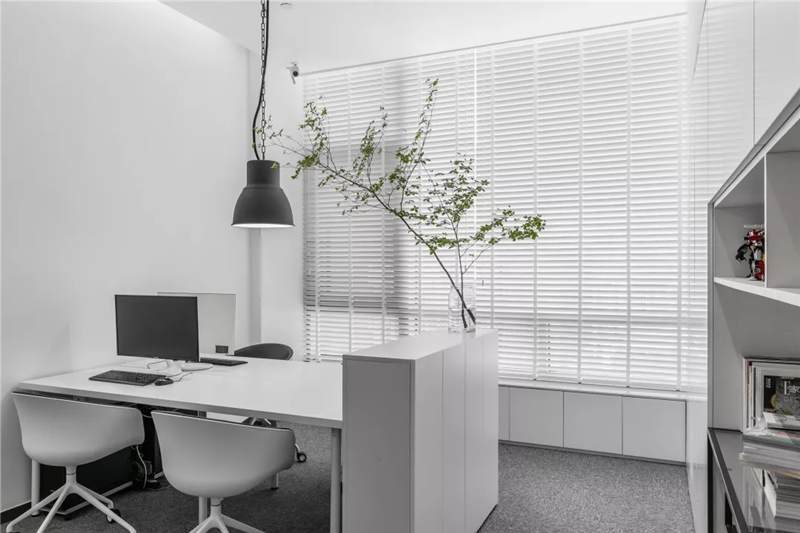 另一側(cè)的空間則增添了二三分私密性。沉穩(wěn)的木質(zhì)案桌上,擺放的綠枝椏仿若思想的觸手,與仙人掌、小株綠植串聯(lián)起空間動線。區(qū)域內(nèi)各自獨(dú)立,用玻璃門分隔開,在保證個人能最大限度沉浸思維創(chuàng)作的同時,又能及時地與伙伴交流互換,碰撞不同的思想。