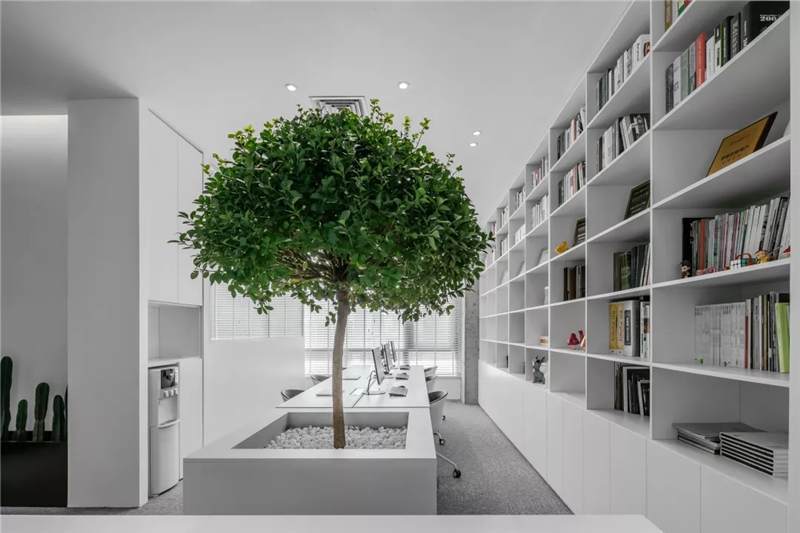 刪繁就簡,以最經(jīng)典的白色為主題搭配色調(diào),沒有繁瑣的設(shè)計和過多的裝飾,減去辦公中的壓抑感。通過將自然純凈的白色與沉靜黑色相結(jié)合,將品牌形象簡潔地呈現(xiàn)表達(dá),同時為左右空間的過渡創(chuàng)建和諧觀感。純白的墻面,接近心靈的澄凈;仙人掌是視覺的焦點(diǎn),恣意生長、堅韌、夯實根基,也正寓意著公司的設(shè)計理念:有所依、有所仗、有所長。