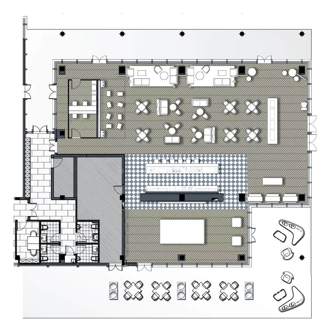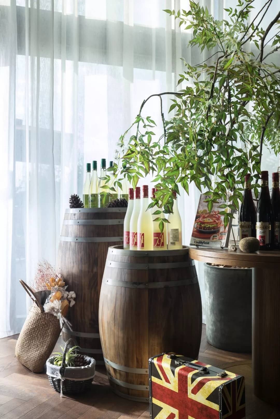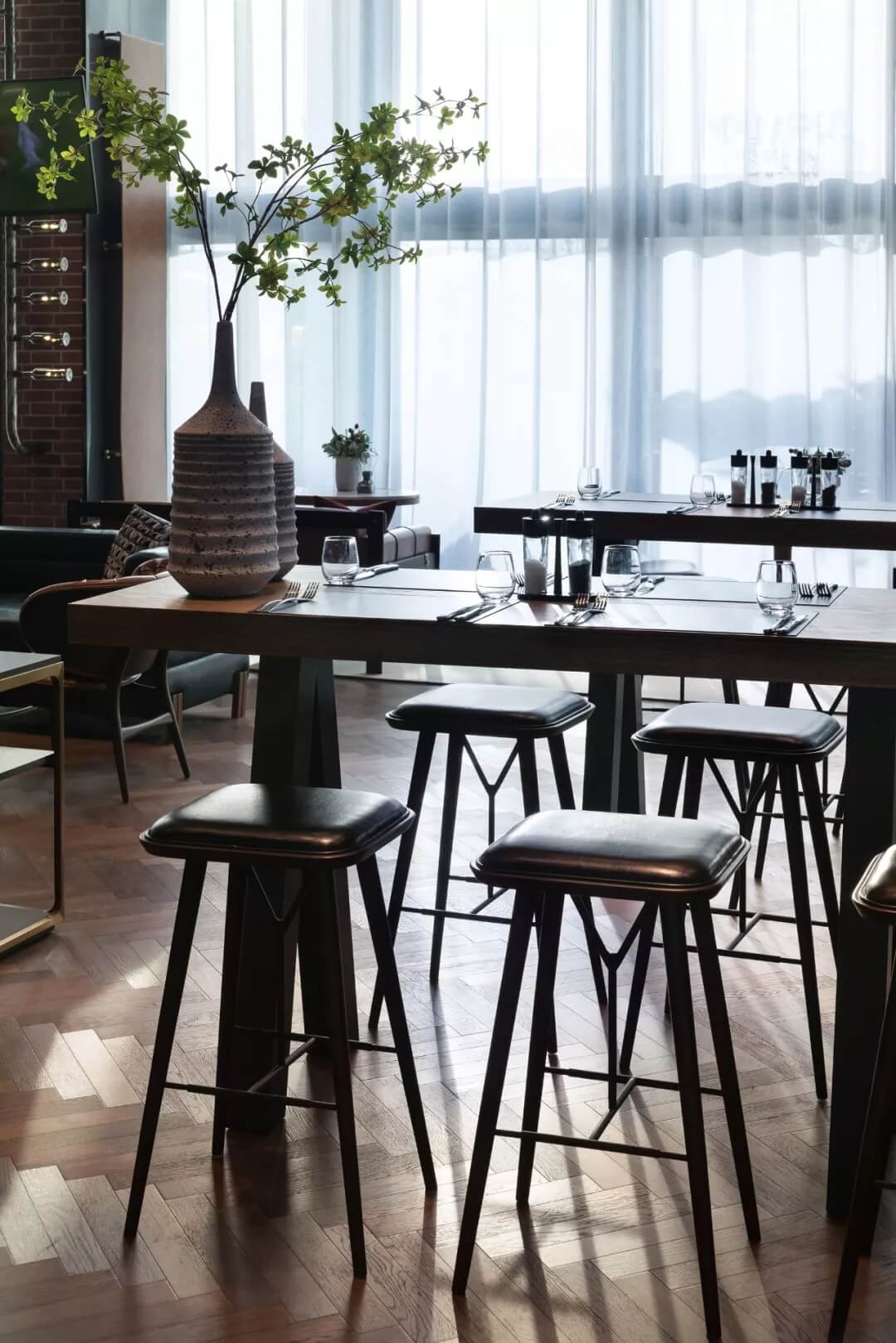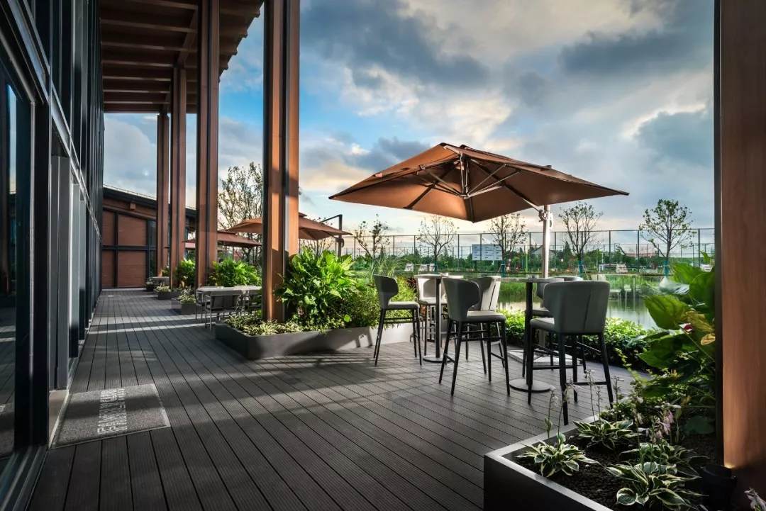 自然的青翠綠意與質(zhì)樸的啤酒桶木藝氣質(zhì)互融,靈韻交加,酒香沁人,不加過多修飾地圍合出一隅相對靜謐的臨窗休閑區(qū)。在這里,設計透過落地玻璃窗的相隔將內(nèi)外視域完全打開,陽光傾灑進來,引入截然不同的清新與濃密的自然舒適度,外在景觀與內(nèi)在布設氣質(zhì)相合。