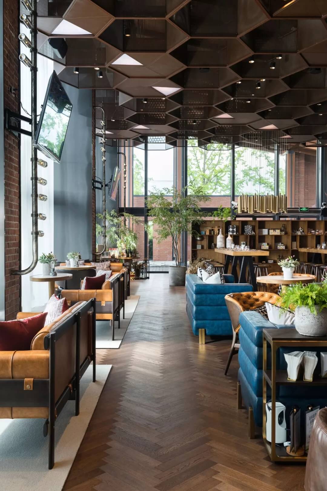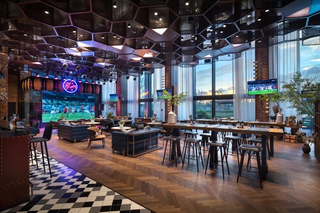 設計將足球的六邊形化用于天花的裝飾上,立體幾何的體量、金屬線條的質(zhì)感賦予了社交空間的適當距離感。多幅大屏幕的配置,讓聚于此的人們,沉浸于啤酒吧和比賽現(xiàn)場的氛圍當中,盡情享受在開闊大氣的空間格局中觀摩賽事的自由,為熱愛喝彩,為夢想干杯,傳遞運動不止的精神。