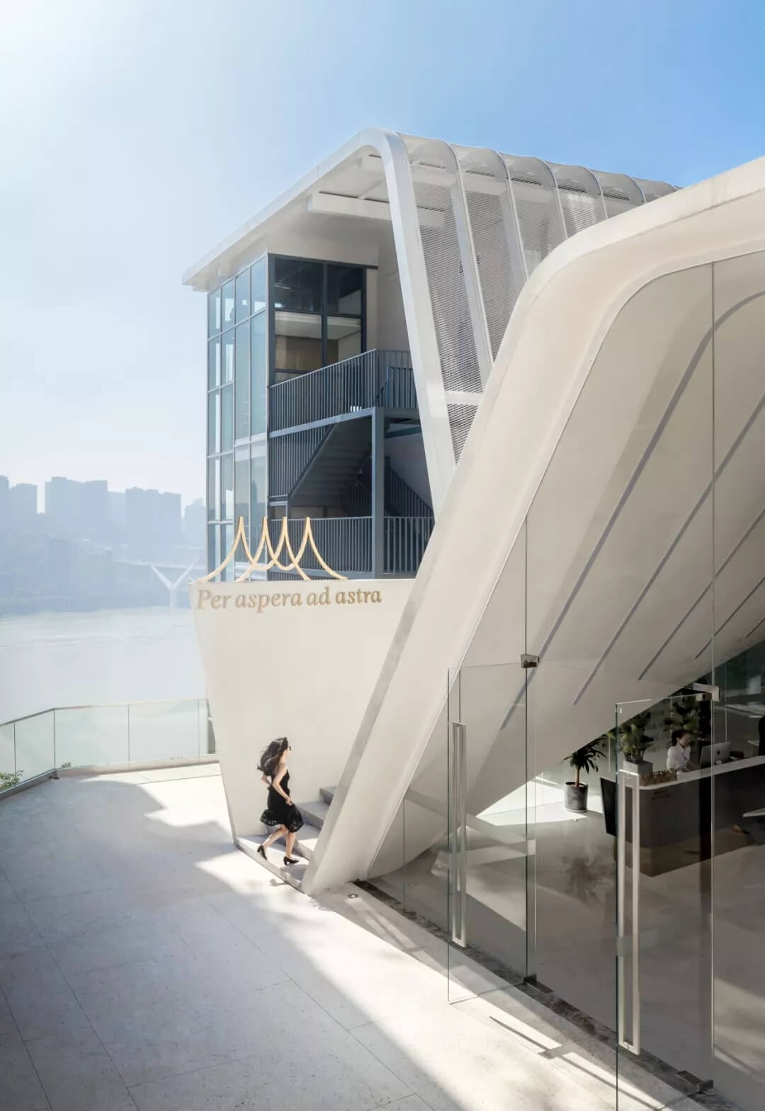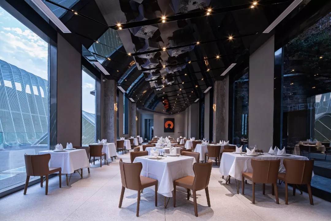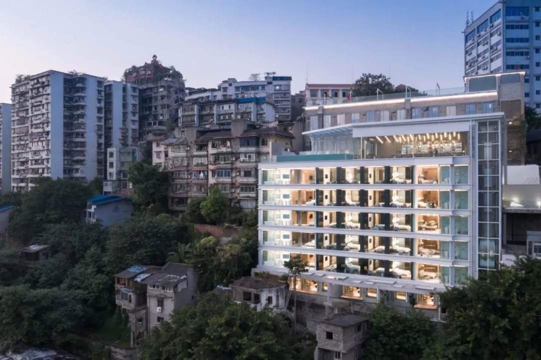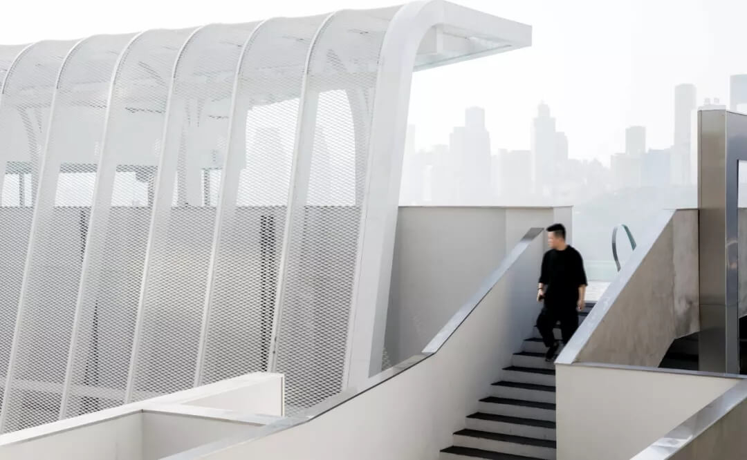 薄殼結(jié)構(gòu)與金屬幕墻構(gòu)成的“裙擺”創(chuàng)造出一層集合酒店接待、休憩與多功能廳的開放服務(wù)空間,漂浮為頂,下落為幕,抬升為廳,下沉為梯,旅客可以在裙擺之上游走,形成一條多變的觀景路徑,還原了山城的空間體驗(yàn)。