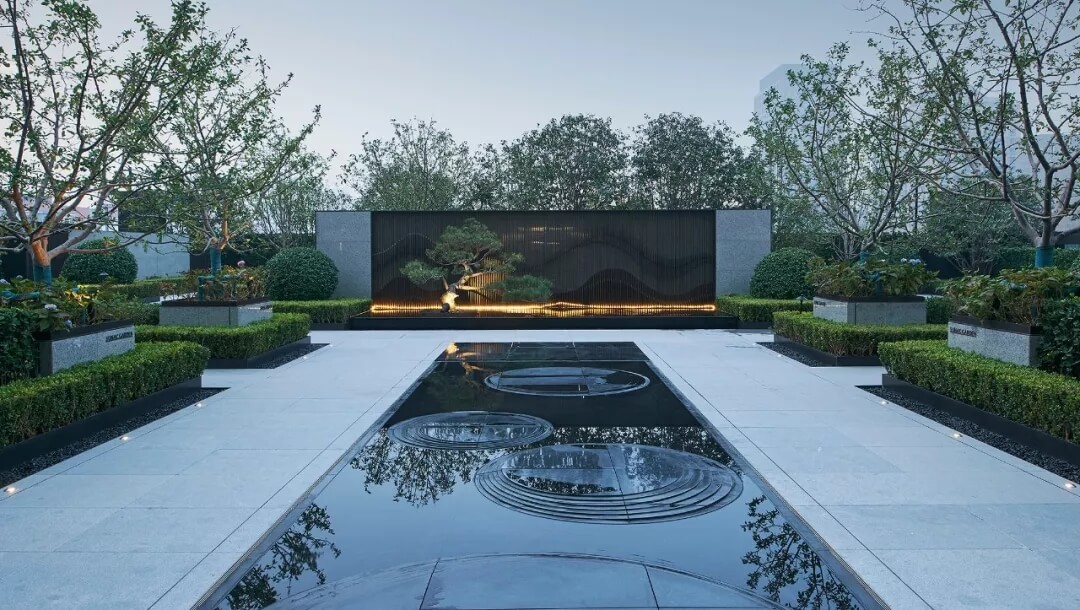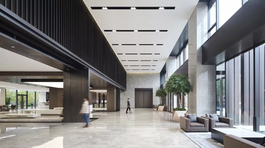 設(shè)計(jì)師通過空間布局,材料選用等營(yíng)造出大堂沉靜務(wù)實(shí)、理性的空間氛圍,咖啡,水聲,盆景,窗外的花園,以及往來的員工,客戶和行人賦予這里靈魂和氣息,使整個(gè)大堂充滿各種可能性。