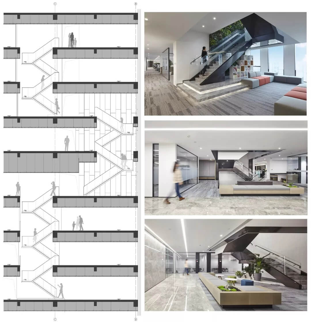 4-11層打通局部樓板增設(shè)步梯,增加吹拔空間,巧妙的貫通上下層空間,加速空氣流通,使空間更加靈動(dòng)透氣,減少空調(diào)使用量,同時(shí)也使各部門聯(lián)系更便捷,溝通更高效 。