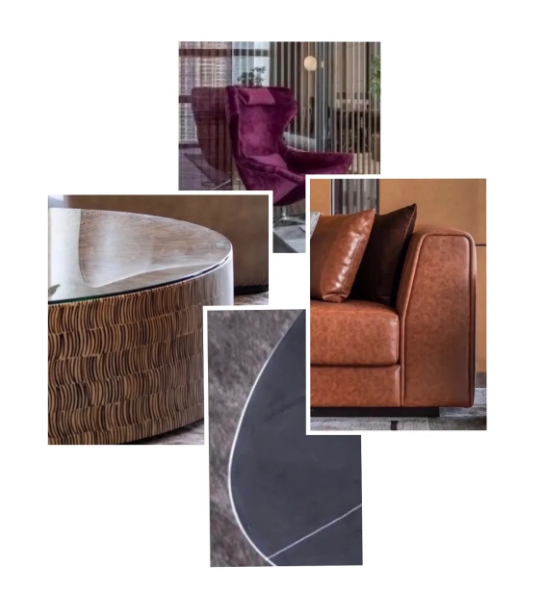 單椅大量使用皮革凸顯質(zhì)感,同時在家具上通過黑鋼、木及玻璃等打造硬朗穩(wěn)重的商務(wù)格調(diào)。