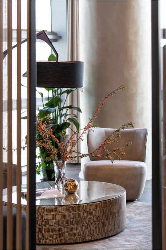 接待區(qū)以弧形沙發(fā)圍合成互動性強的洽談狀態(tài),金屬紋理圓幾在光的參與下呈現(xiàn)精致的一面,格柵半掩,意式沙色時尚簡約家具,凸顯了實用與美學(xué)的無聲契合。