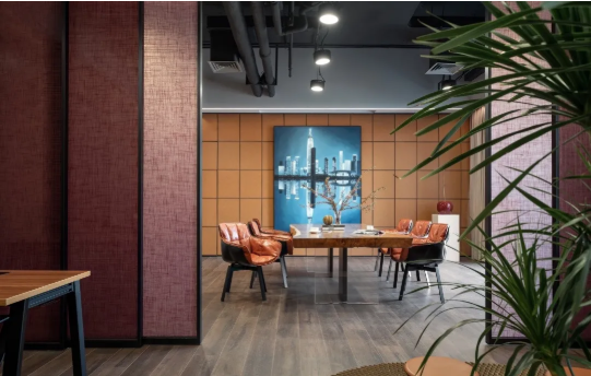 設(shè)計師認為辦公空間的設(shè)計也應(yīng)該是溫暖的、充滿關(guān)愛的,通過空間的靈活切換為客戶創(chuàng)造更多的商業(yè)價值。墻面以磁性黑板漆穿插其間,實現(xiàn)視覺上的層次迭代。薄暮紫夾絲玻璃推拉門實現(xiàn)了會議室與辦公區(qū)的自由切換,開放式空間為來此進行房產(chǎn)咨詢的精英人士提供了線下答疑、培訓(xùn)學(xué)習(xí)的平臺,成就雙方合作共贏的發(fā)展期待。