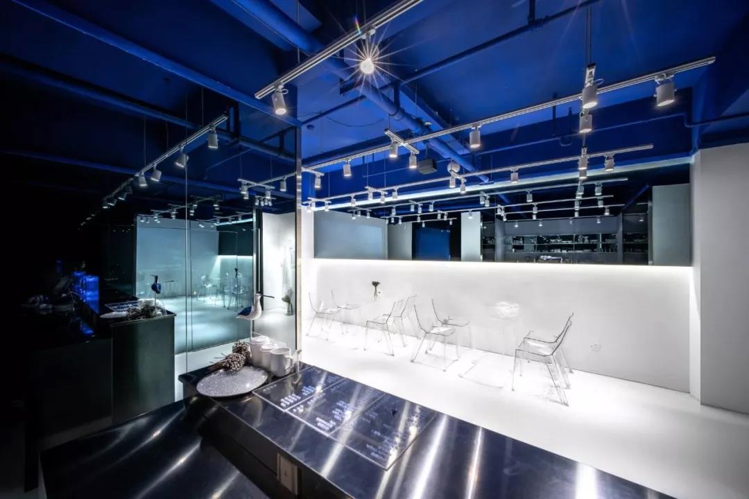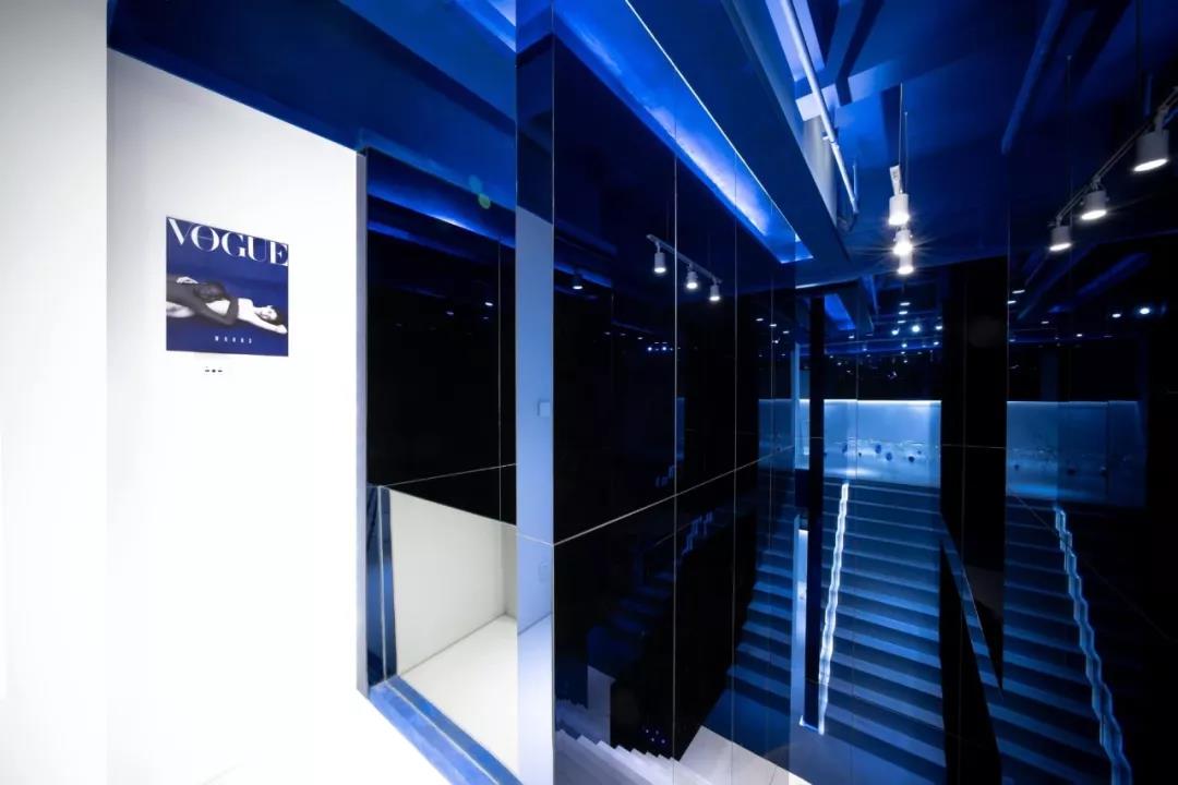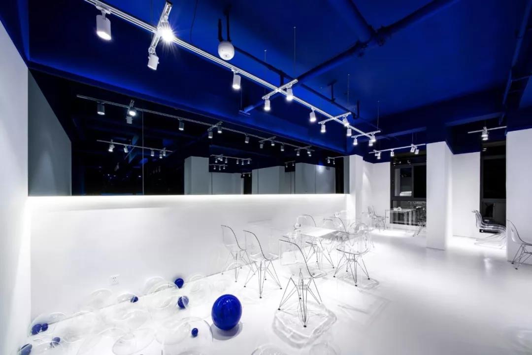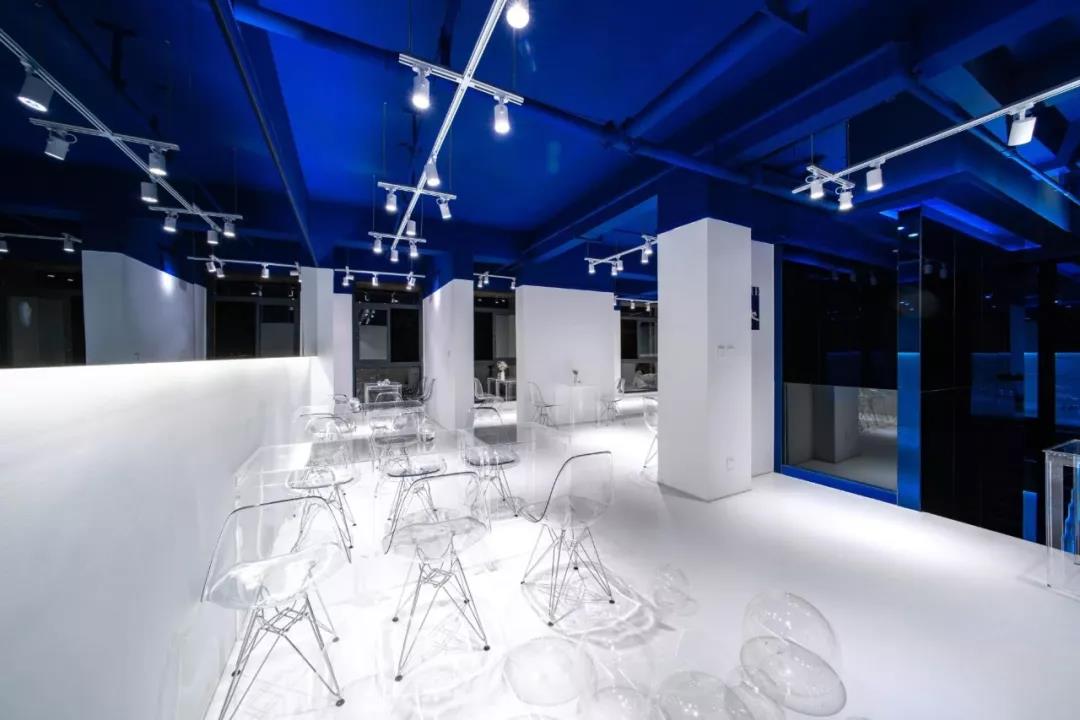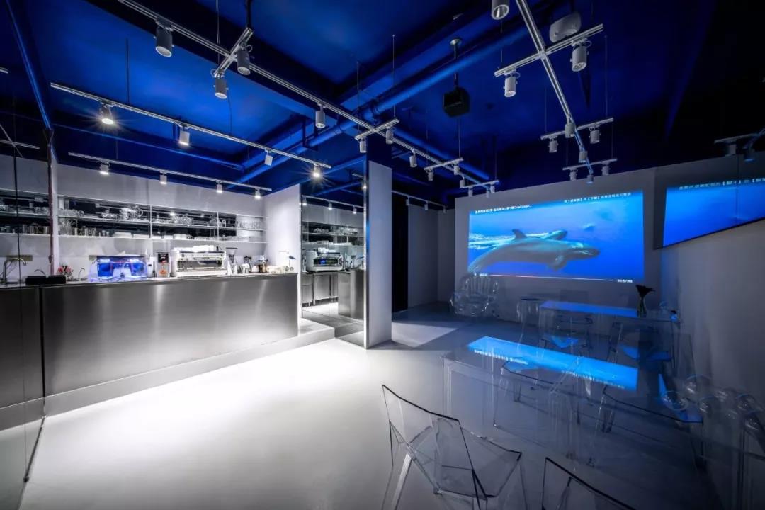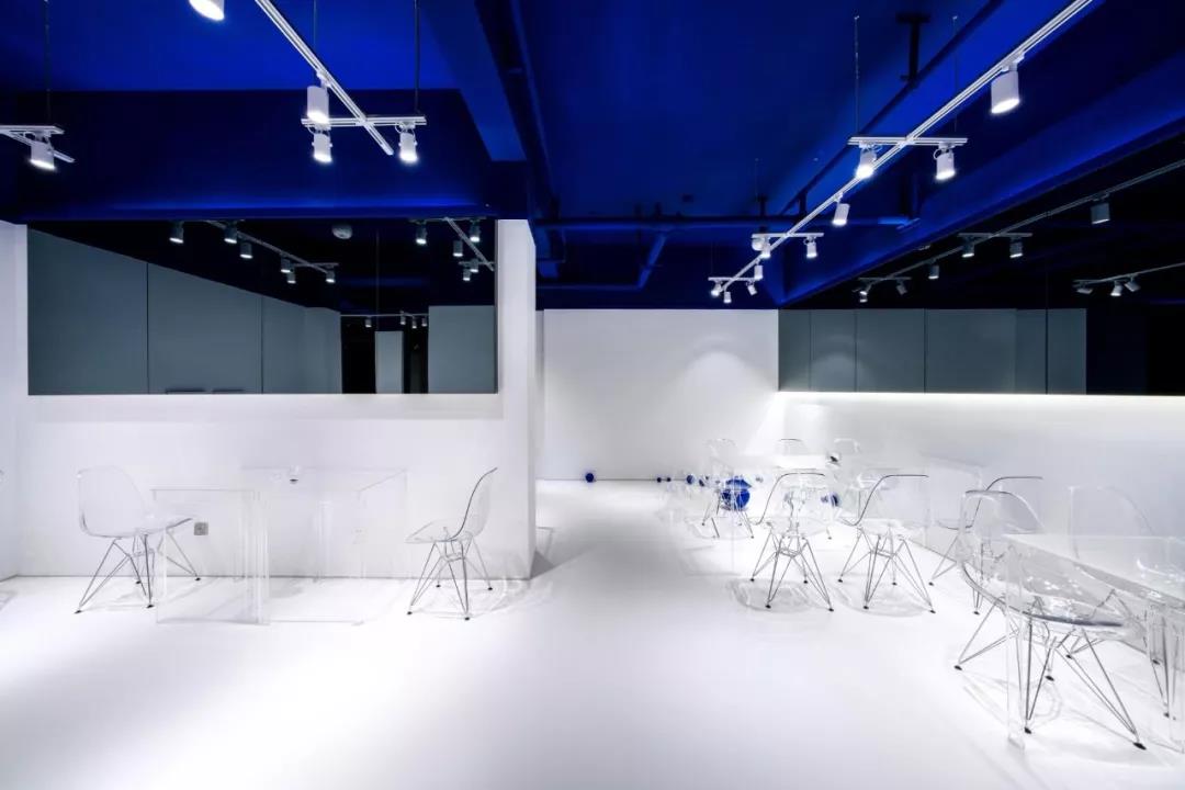 帶著這樣的邏輯,整個(gè)空間的設(shè)計(jì)就很明確了,拆除原有的吊頂,用涂料做成藍(lán)色的“天空”;下面的空間則使用帶有反射性/透明性的材料——鏡面、金屬、亞克力、塑料等,通過(guò)這種曖昧的委婉的,而非簡(jiǎn)單粗暴的方式,讓深海的藍(lán)色充滿(mǎn)整個(gè)空間。