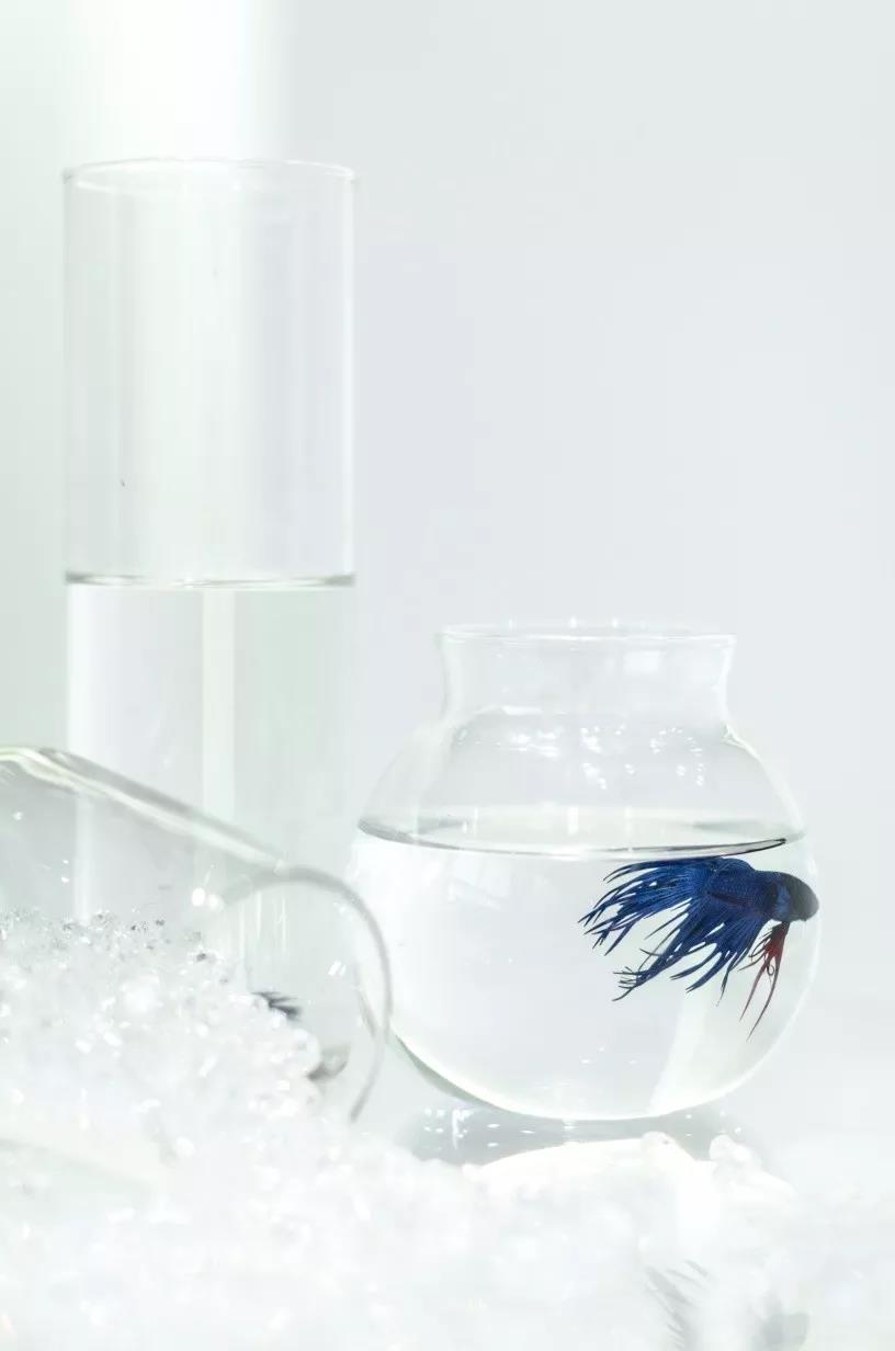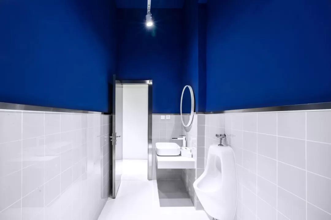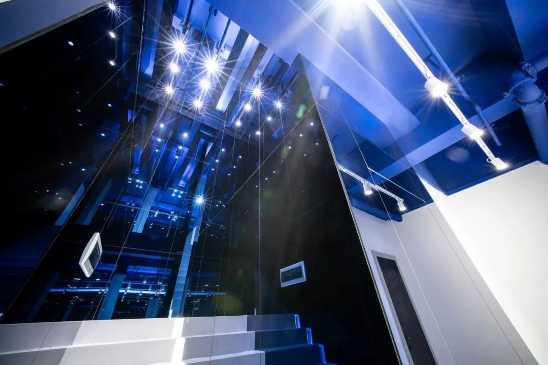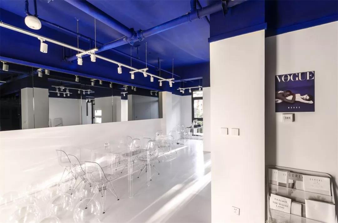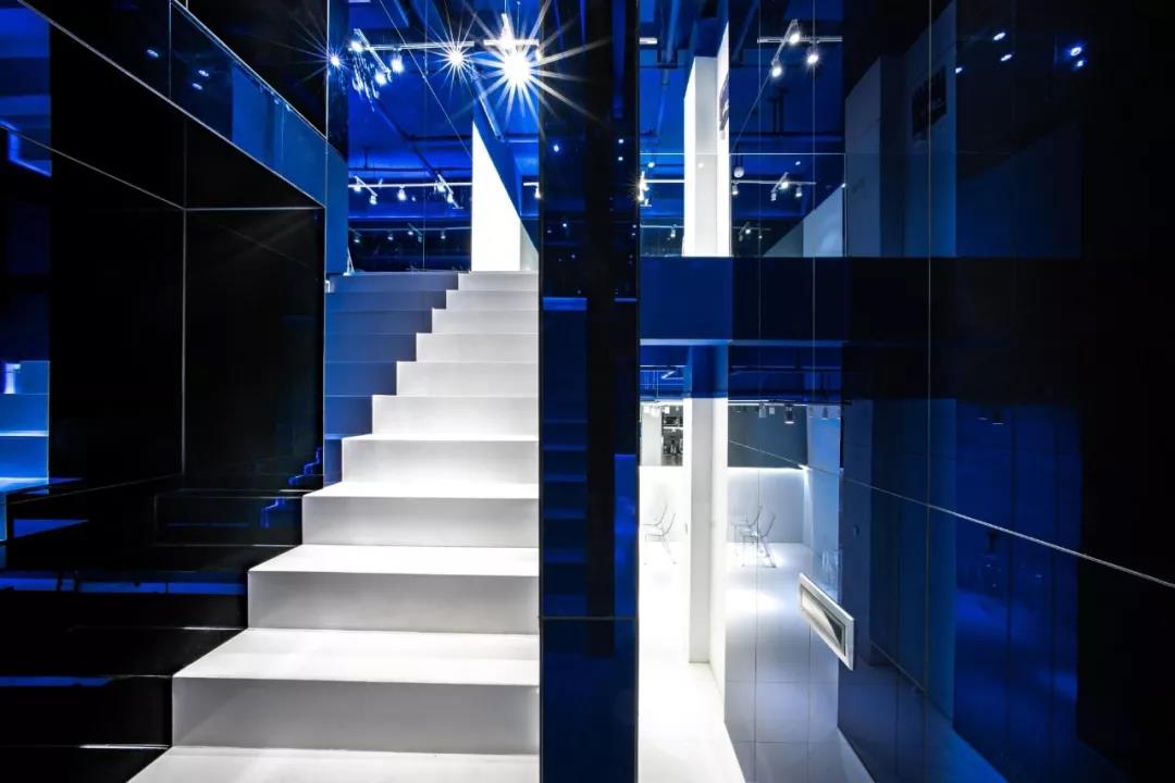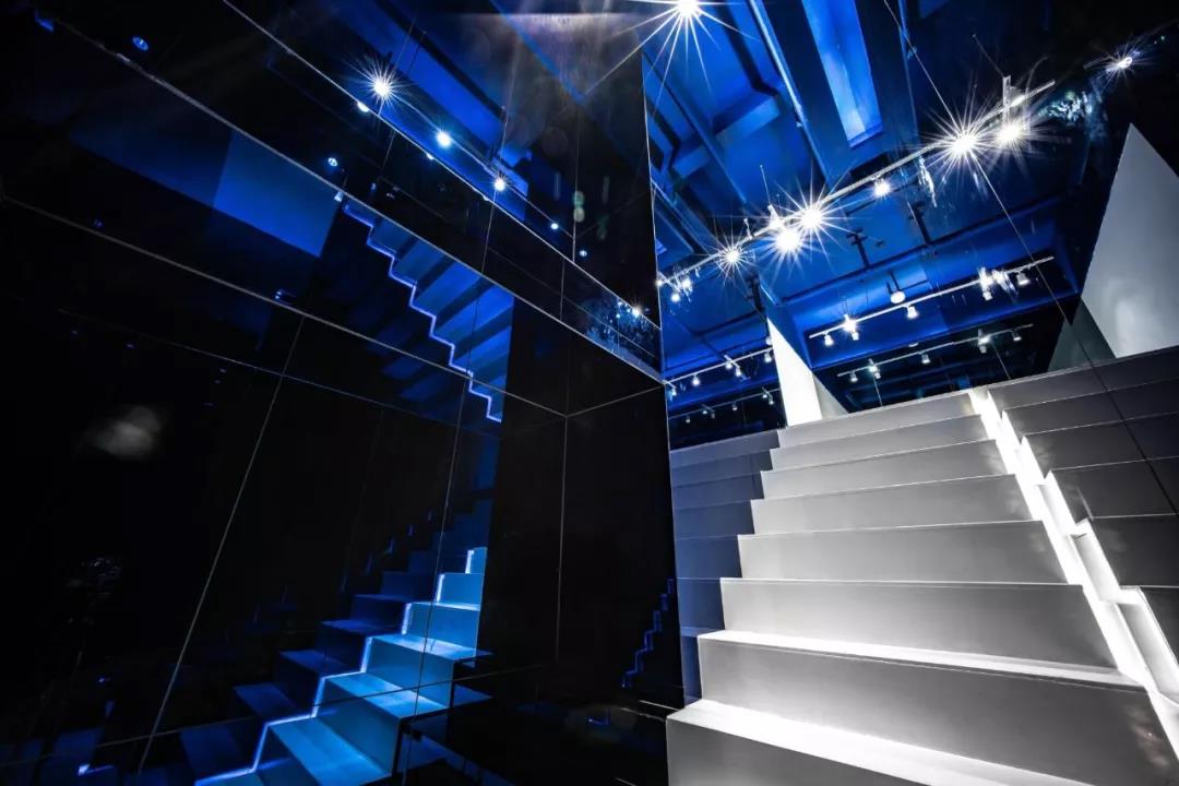 帶著這樣的邏輯,整個(gè)空間的設(shè)計(jì)就很明確了,拆除原有的吊頂,用涂料做成藍(lán)色的“天空”;下面的空間則使用帶有反射性/透明性的材料——鏡面、金屬、亞克力、塑料等,通過(guò)這種曖昧的委婉的,而非簡(jiǎn)單粗暴的方式,讓深海的藍(lán)色充滿(mǎn)整個(gè)空間。