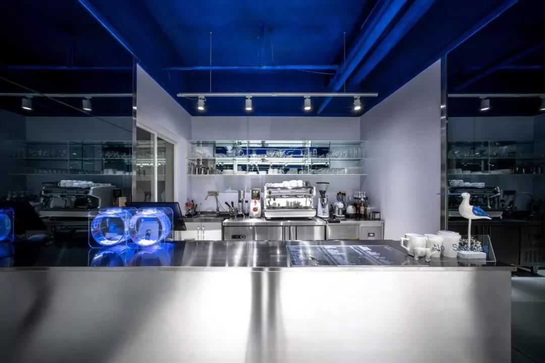 因?yàn)闃I(yè)主確定咖啡館名字叫“深海”,所以設(shè)計(jì)師花了心思去思考到底“深海”是什么。不同于常規(guī)的思考和正常做設(shè)計(jì)時(shí)搜索參考圖片的是,往往這樣的設(shè)計(jì)都是帶有藍(lán)色的空間,但“深海”這個(gè)名稱(chēng)所帶來(lái)的概念思考卻是,為什么深海是藍(lán)色的?當(dāng)透過(guò)這層思考方式去搜索就會(huì)發(fā)現(xiàn),海水之所以是藍(lán)色,是因?yàn)樘炜帐撬{(lán)色的(原理就不多說(shuō)了),水體(空間)是透明的,所以深海的藍(lán)色是光和材料本身所產(chǎn)生的而非通過(guò)“設(shè)計(jì)”創(chuàng)造的。