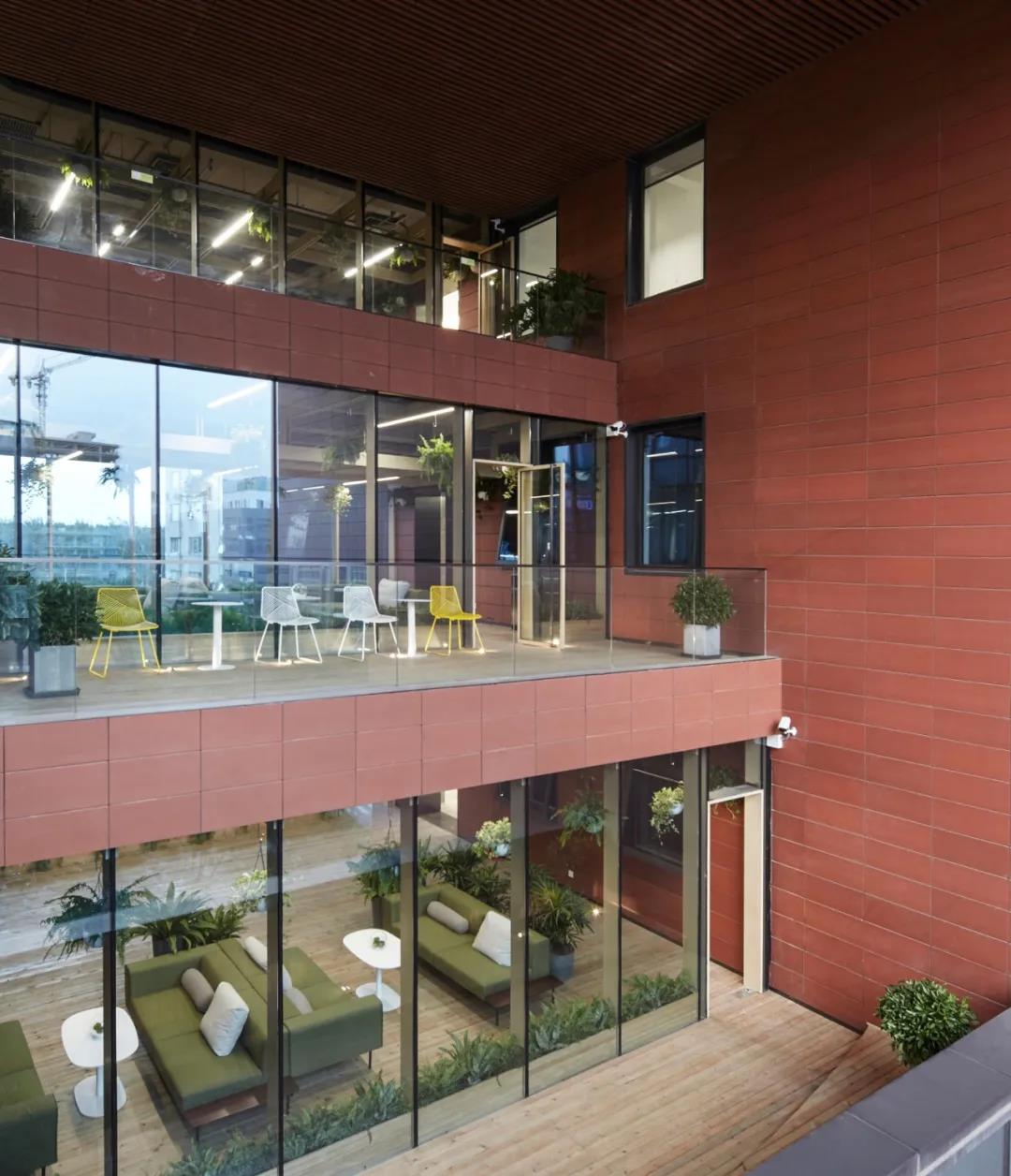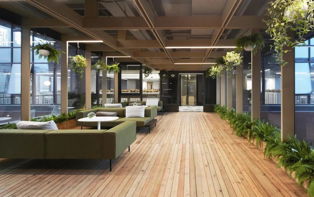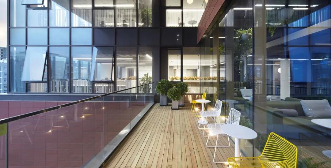 在建筑中段的4-6層,是一處半室外的連橋空間。通過(guò)結(jié)構(gòu)適度改造營(yíng)建了三個(gè)疊落的空中花房,同時(shí)每個(gè)花房都配有戶外露臺(tái)作為空間延展。矩陣型木質(zhì)天花延伸到側(cè)墻并落地,地面鋪防腐木條,整個(gè)空間配備綠植,營(yíng)造輕松、生態(tài)的戶內(nèi)外休憩空間,同時(shí)還可作為研討,舉辦小型活動(dòng)的多功能空間使用。