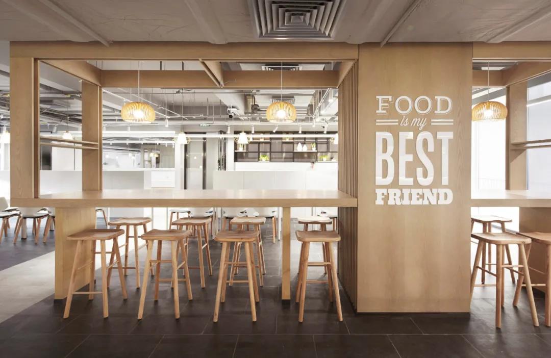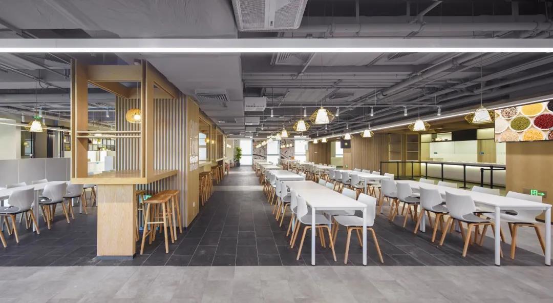 不同于其他辦公樓餐廳布置在地下層,vivo以三層作為生活服務(wù)區(qū),集中布局健身和餐廳,方便管理并對(duì)其他辦公層影響較少。餐廳入口使用磨砂鏡彩繪圖案,指示清晰,內(nèi)部通過(guò)地面鋪磚、桌椅組擺等方式設(shè)置出等候,取餐,就餐,收盤等交通動(dòng)線,維護(hù)空間秩序,營(yíng)造出輕松舒適整潔的就餐環(huán)境。