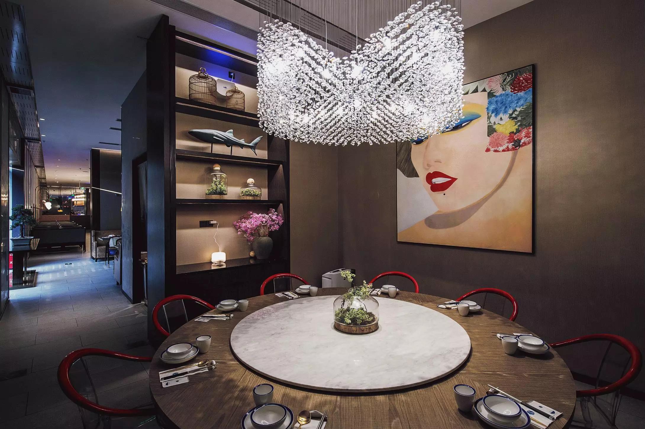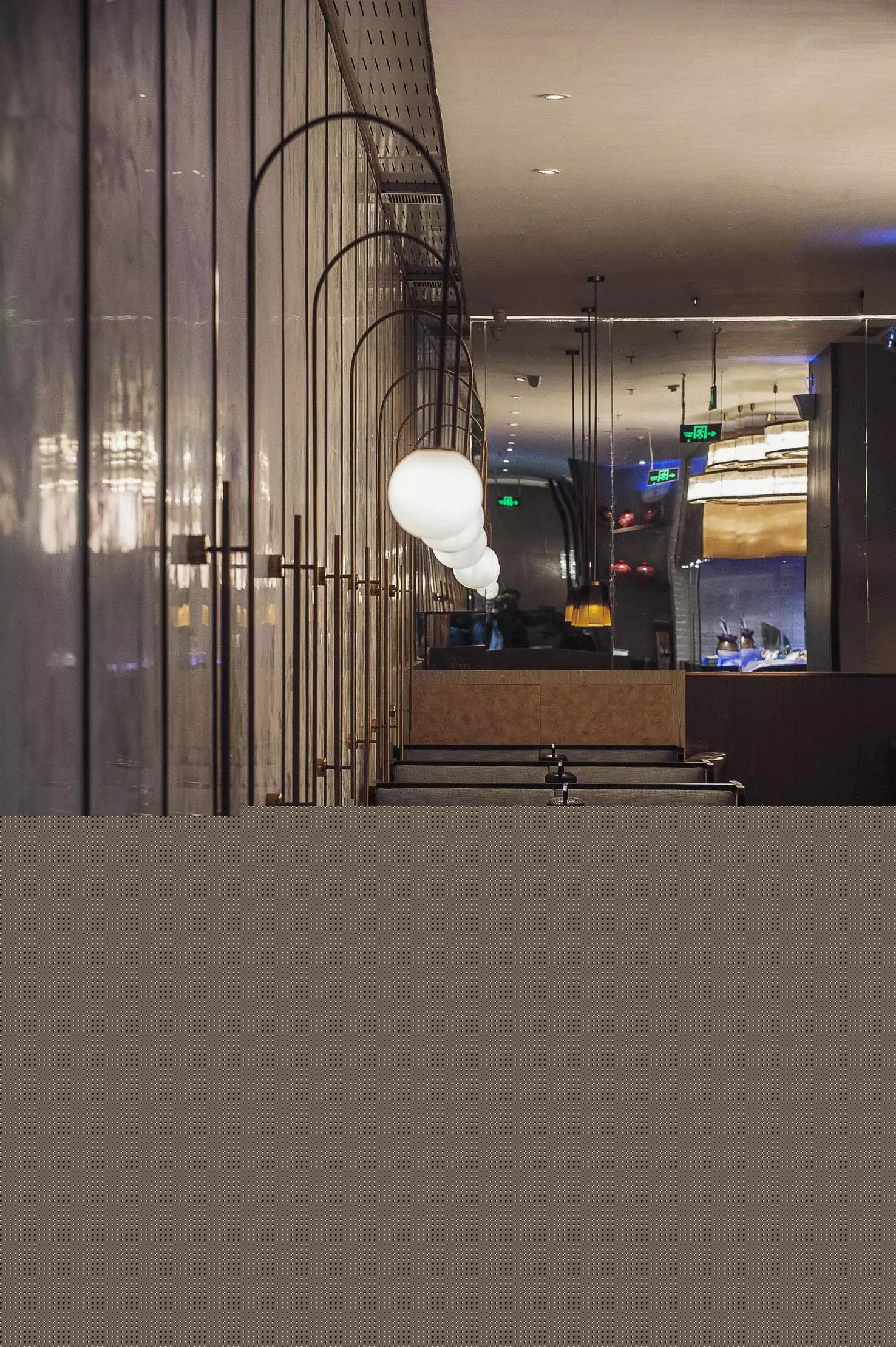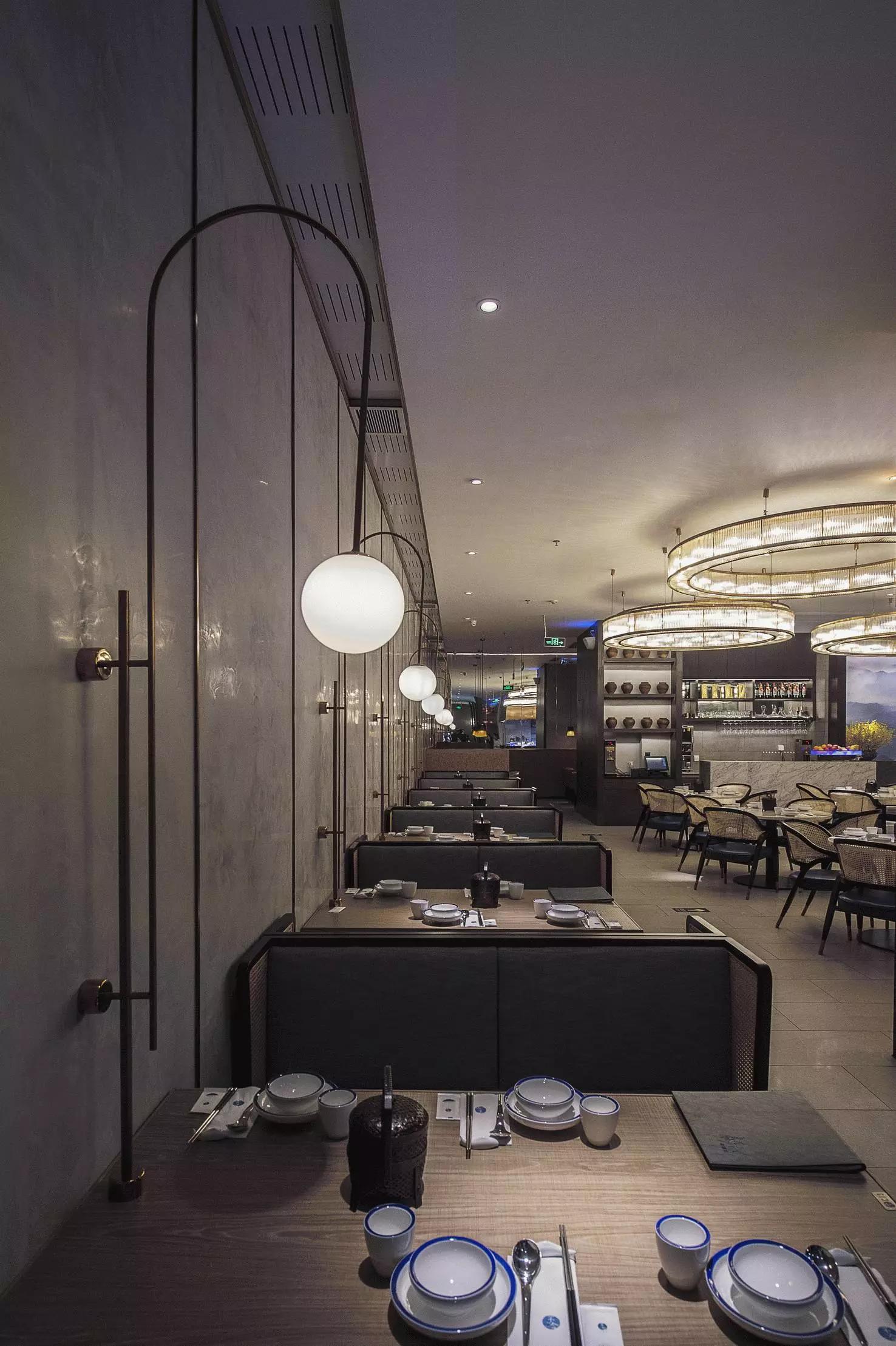 用餐區(qū)完全是一個開放的空間,沒有很多的隔斷,圓桌和方桌有序排布,既充分利用了空間又避免了單調(diào),結合燈具的設計,就像在老家庭院里的大家庭聚餐——夜晚,歸來的親人們,在清涼的月色中,你來我往,和和樂樂,傳遞此間。
