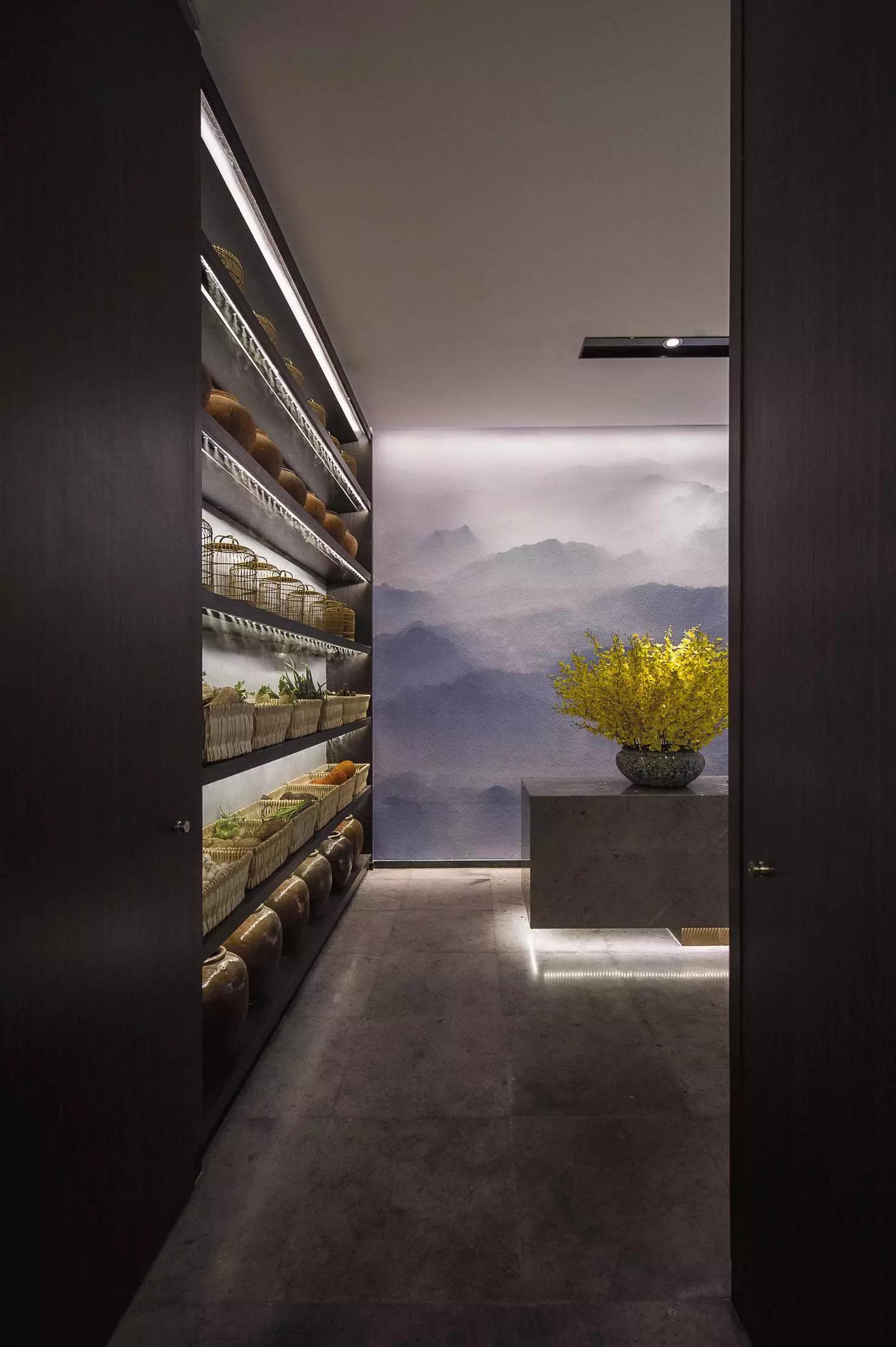 收納在藤筐和陶罐里的各種食材,在這里能搜尋到福建山珍海味的只鴻片羽,也讓人不由地想起老家廚房里食材上新鮮的泥巴味。半通透的玻璃隔斷起到了分割空間的作用,又不至于讓入口過于逼仄,雕花玻璃貼膜起到很好的裝飾作用。